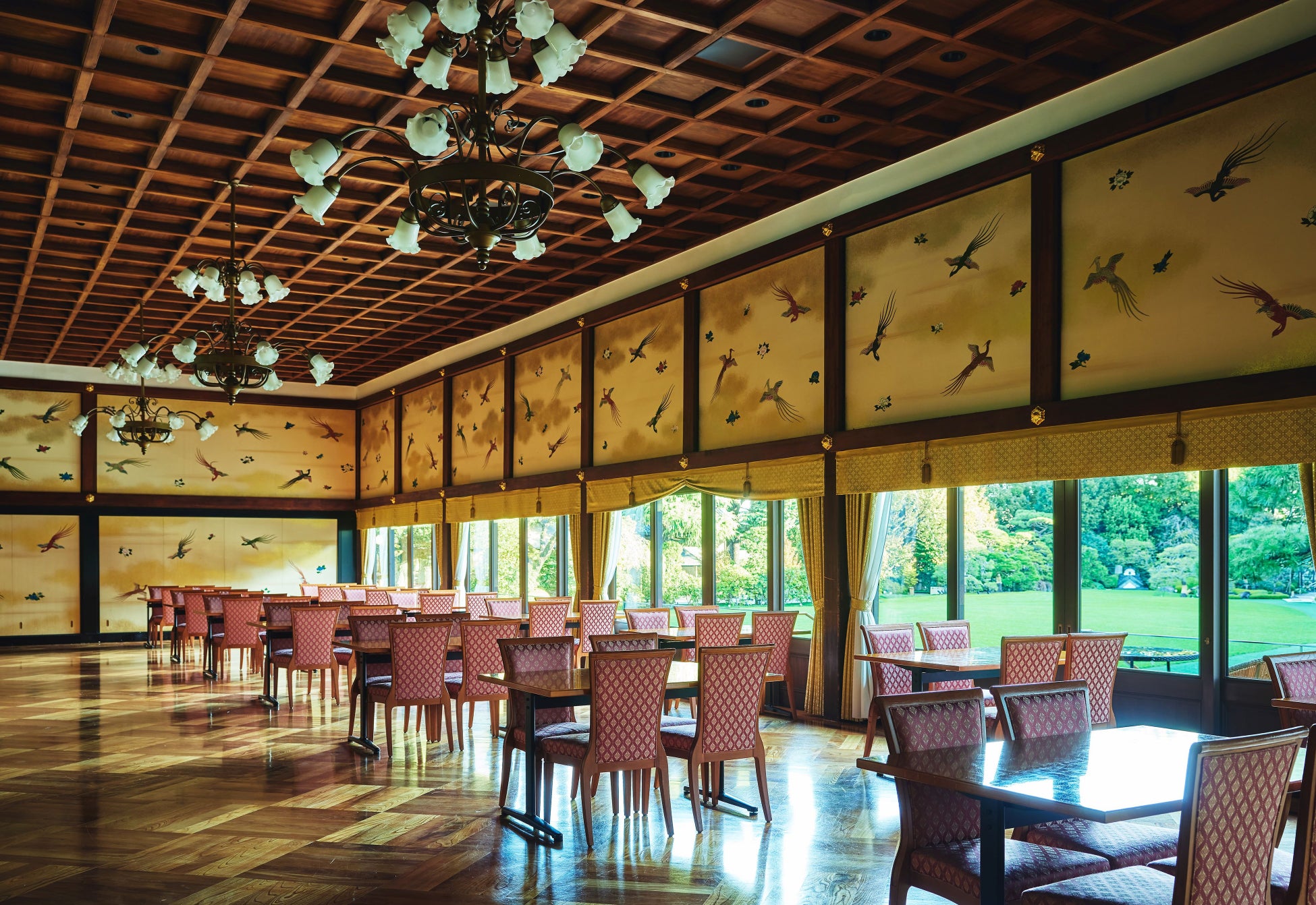 二度の移築を経て、昭和22(1947)年に『明治記念館』の名称で総合結婚式場として開館式が挙行され、以来21万組を超えるご夫婦の新しい門出をお祝いしてきました。令和2年(2020)には歴史的・建築的価値が認められ、本館が東京都指定有形⽂化財(建造物)に指定。明治天皇の宮廷外交の舞台となったダイニングホール(御会食所)は、平日は主にラウンジ「kinkei」のカフェとしてご利用になれます。